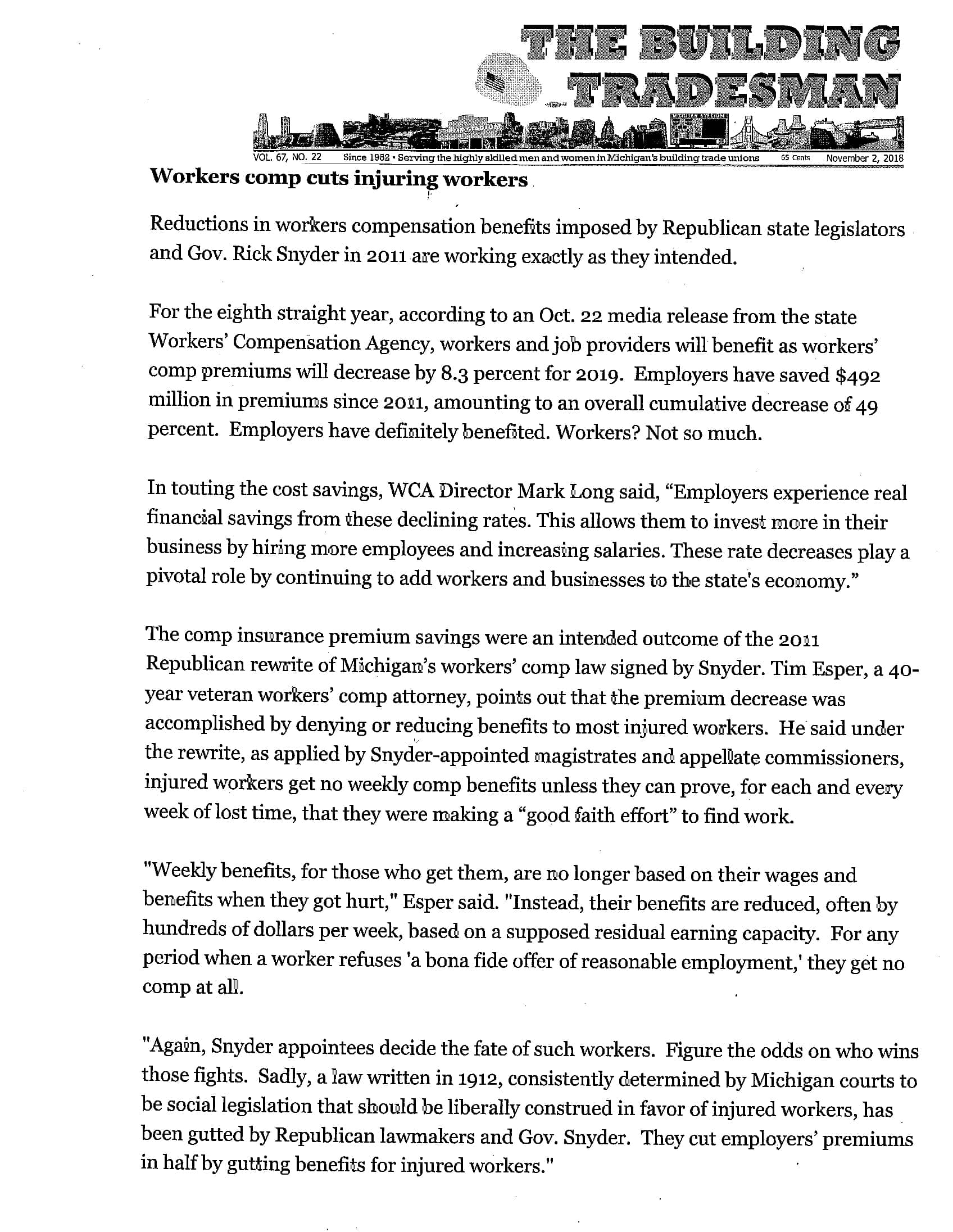 Tim Esper, a 40-year veteran workers’ comp attorney, points out that the premium decrease was accomplished by denying or reducing benefits to most injured workers. He said under the rewrite, as applied by Snyder-appointed magistrates and appellate commissioners, injured workers get no weekly comp benefits unless they can prove, for each and every week of lost time, that they were making a “good faith effort” to find work.