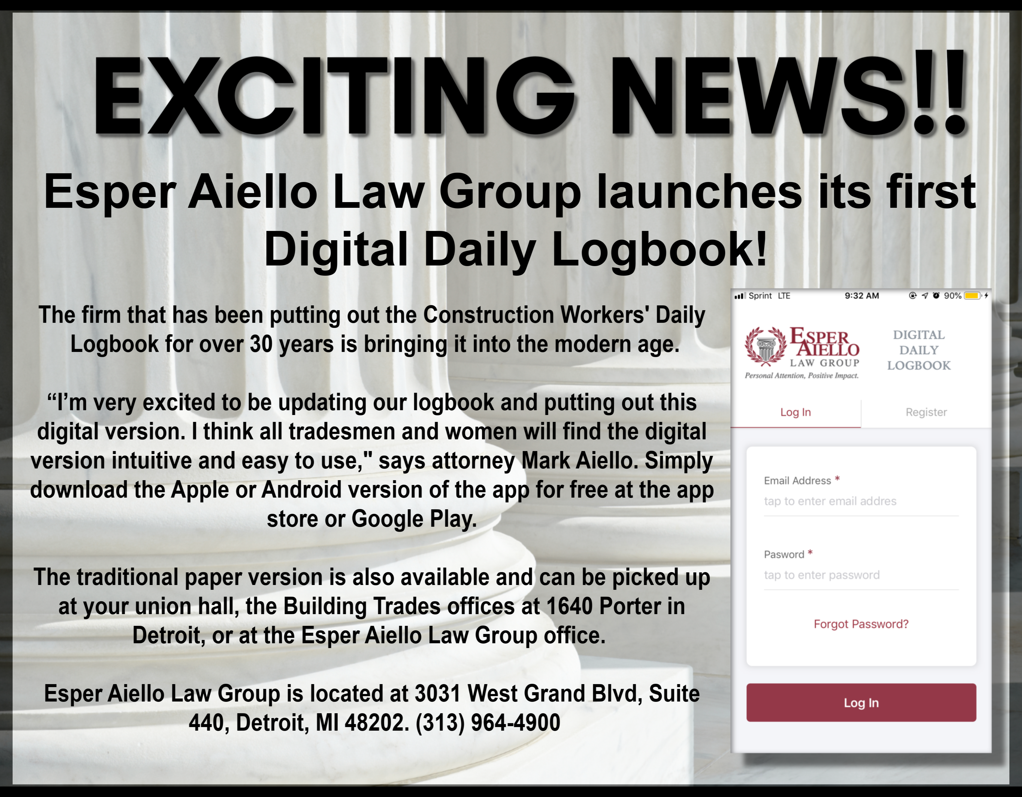 Esper Aiello Daily Logbook is currently live and available for free download on both the Apple App Store and Google Play Store. Applicable users are encouraged to download and begin registering a personal account through the app today. Additional information on precisely how this app can significantly improve the ease and efficiency of any job site’s data retention can be obtained by contacting Aiello Law Group directly through their official website at aiellolawgroup.com/contact, or by telephone at 313.964.4900 .