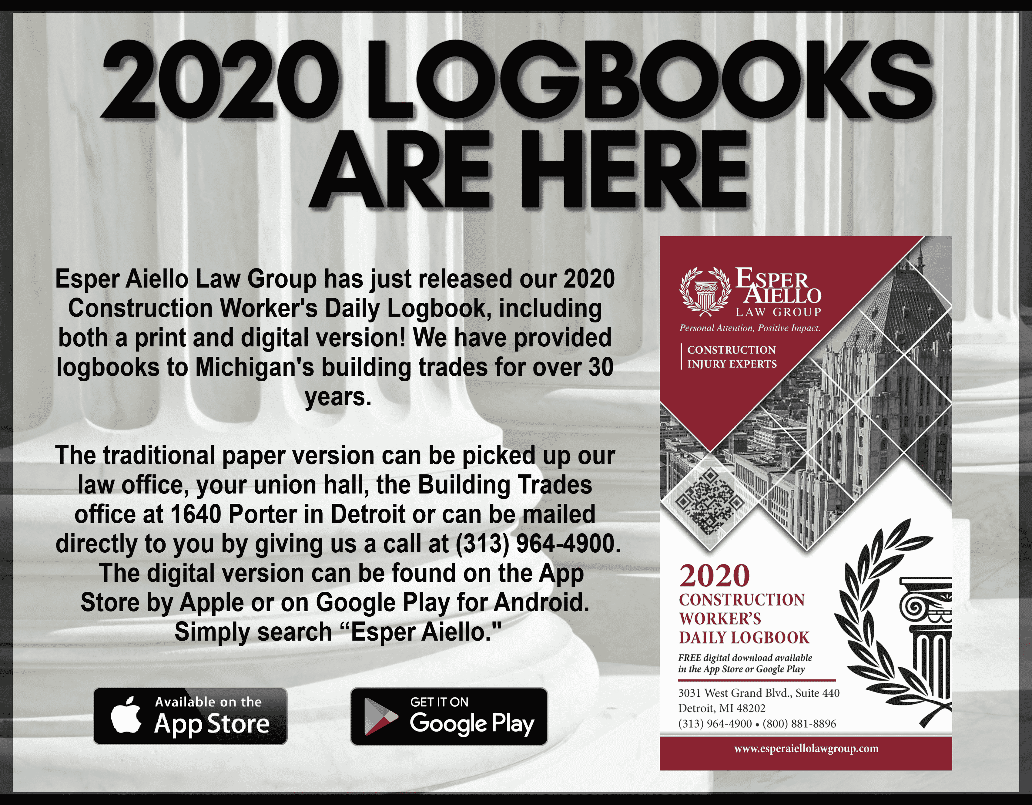 The traditional paper version can be picked up at your union hall, the Building Trades offices at 1640 Porter in Detroit, or can be mailed by giving Aiello Law Group a call at 313.964.4900 . The digital version is found in the Apple App Store or Google Play on Android. Simply search for “Esper Aiello.”